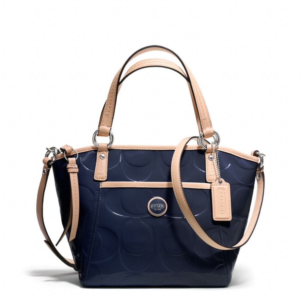 COACH F25190 - SIGNATURE STRIPE EMBOSSED PATENT SMALL POCKET TOTE - SILVER/NAVY/TAN - HANDBAGS