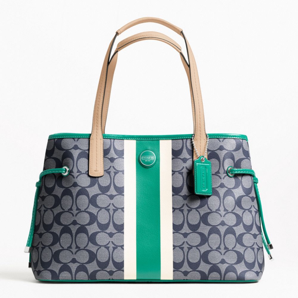 COACH F22908 - SIGNATURE STRIPE PVC STRIPE CARRYALL - SILVER/NAVY/BRIGHT JADE (click the link before for more detail)