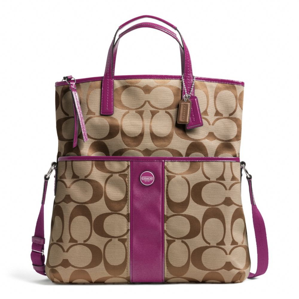 COACH F23304 - SIGNATURE STRIPE FOLDOVER TOTE - SILVER/KHAKI/PASSION BERRY (click the link before for more detail)