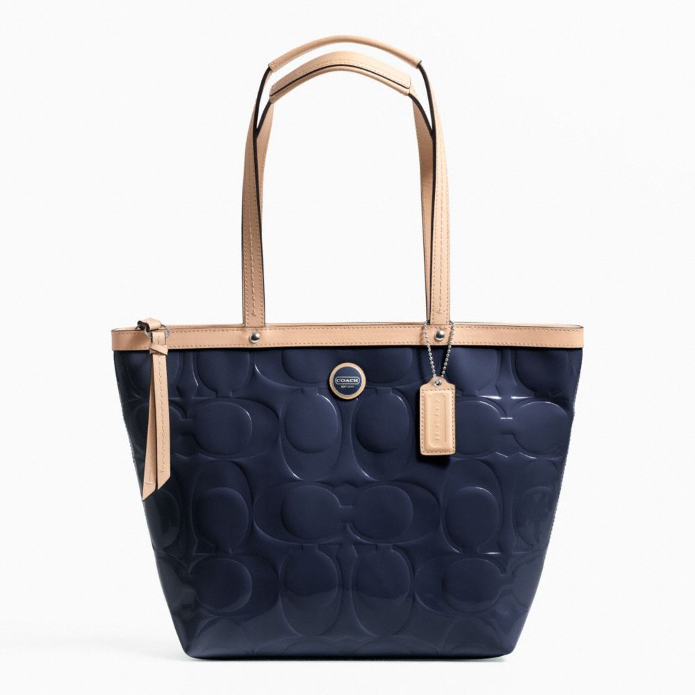 COACH F25187 - SIGNATURE STRIPE EMBOSSED PATENT TOTE - SILVER/NAVY/TAN - HANDBAGS