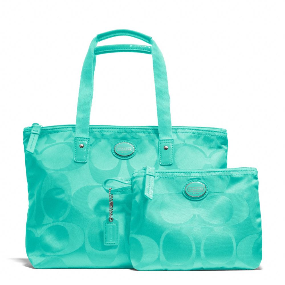 COACH F77322 - GETAWAY SIGNATURE NYLON SMALL PACKABLE TOTE - SILVER/AQUA (click the link before for more detail)