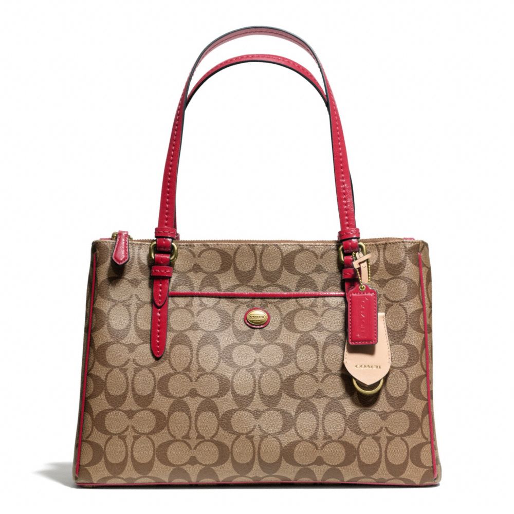 COACH F24603 - PEYTON SIGNATURE JORDAN DOUBLE ZIP CARRYALL - BRASS/KHAKI/RED - HANDBAGS